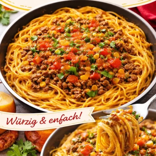 Kurzüberblick: Du brätst das Hackfleisch an, schwenkst Zwiebel, Paprika und Knoblauch dazu, rührst Taco-Gewürz, Tomaten und Frischkäse ein, legst die Spaghetti in die Pfanne und gießt Wasser an. Nachdem die Nudeln weich sind, wird alles mit Cheddar cremig gemacht und mit Koriander serviert. Erwartete Zeit: etwa 25–30 Minuten.