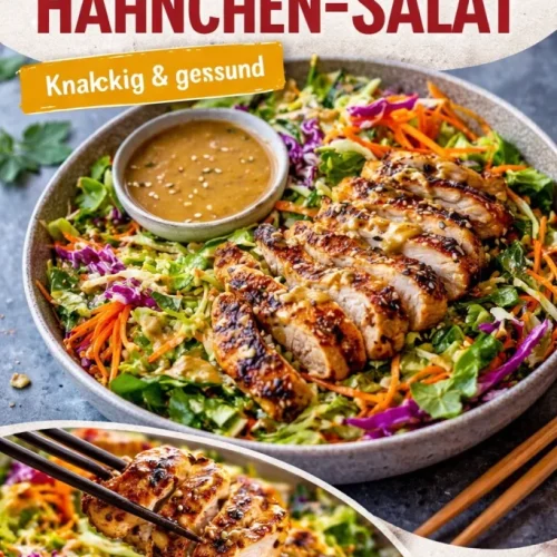 Wenn du nach weiteren Inspirationen für asiatisch beeinflusste Hühnchensalate suchst, bietet Foolproof Living ein ähnliches Asian Sesame Chicken Salad-Rezept mit Mandeln und Sesam, das interessante Topping-Varianten zeigt. Für eine andere Herangehensweise an Dressing und Nussnoten ist auch das Rezept bei Little Spice Jar für Asian Sesame Chicken Salad eine gute Referenz. Viel Spaß beim Ausprobieren — und denk daran, Toppings und Schärfe an deinen Geschmack anzupassen!