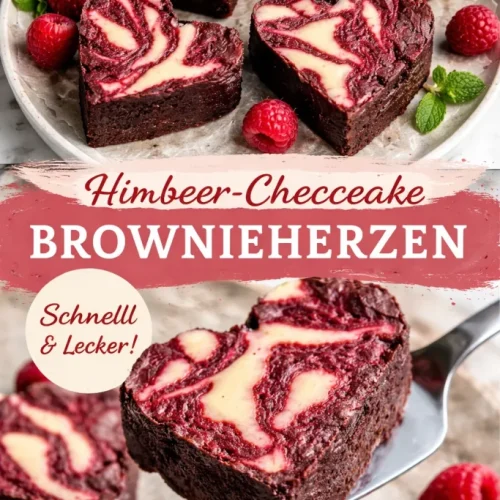 Brownieherzen mit Cheesecake & Himbeerswirl sind ein kleines Stück Backkunst: dicht, schokoladig und doch frisch durch die Himbeeren. Sie sind perfekt, wenn du etwas zeigen willst, das zuhause machbar aussieht, aber trotzdem wie aus der Konditorei wirkt.