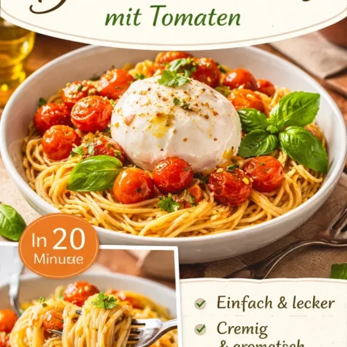 Wenn du noch mehr Inspiration für gebackene Burrata oder Ofenpasta suchst, lohnt sich ein Blick auf dieses ausführliche Rezept für Tagliatelle mit Cherrytomaten und Burrata, das ähnliche Techniken nutzt. Für weitere Varianten der Burrata-Pasta aus dem Ofen ist dieses Trend-Rezept zur Burrata Pasta eine schöne Ergänzung. Viel Spaß beim Nachkochen — und genieße den Moment, wenn du die Burrata anlöchst und die cremige Mitte sich über die Pasta verteilt.