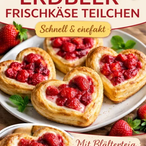 Dieses Rezept kombiniert drei Dinge, die fast jeder mag: buttriger Blätterteig, cremiger Frischkäse und frische Erdbeeren. Es ist schnell (unter 30 Minuten aktive Arbeit), budgetfreundlich (fertiger Blätterteig spart Zeit) und sieht dank der Herzform besonders hübsch aus — ideal für Gäste oder zum Verschenken.