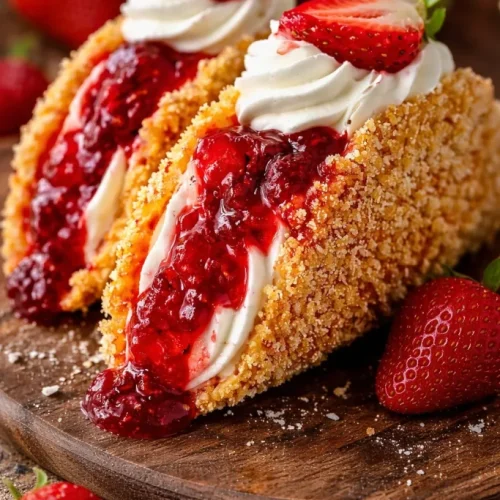 Dieses Dessert verbindet bekannte Lieblingskomponenten: Cheesecake-Creme, knusprige Keksbrösel und fruchtige Erdbeeren. Es ist besonders praktisch, weil die Taco-Schalen als essbare „Form“ dienen — keine Backzeit, wenig Abwasch und sofort servierfertig. Perfekt für Sommerspiele, Kindergeburtstage oder spontane Kaffeebesuche.