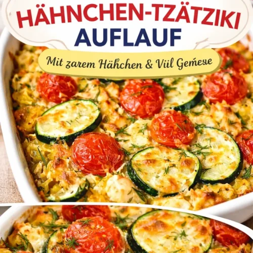 Ja — in diesem Rezept wird mit gekochtem Hähnchen gearbeitet. Wenn du rohes verwendest, gare es zuerst vollständig, sonst wird es im Auflauf nicht sicher durchgegart.Kann ich das Tzatziki selbst machen?