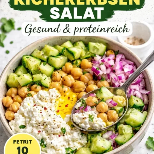 Ich liebe diese Käse- und Kichererbsensalat-Schüssel an Tagen, an denen es schnell, nahrhaft und trotzdem spannend sein soll. Kombiniert werden cremiger Hüttenkäse und proteinreiche Kichererbsen mit knackigem Gemüse und einer frischen Zitronenvinaigrette — perfekt als leichtes Mittagessen, sättigende Beilage oder als Meal-Prep für die Woche. Wenn Sie auf der Suche nach weiteren herzhaften Suppen als Begleiter sind, passt das perfekt zu einer wärmenden Brokkoli-Suppe.
