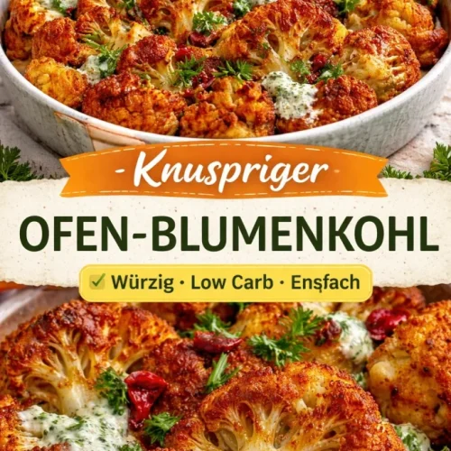 Wenn du eine einfache, aromatische und flexible Beilage suchst, ist dieser knusprige Ofen‑Blumenkohl ein schneller Sieger für Alltag und Gäste. Für weitere kreative Ofenrezepte mit ähnlichem Wohlfühlcharakter schau dir die Anleitung zur Pizza in der Pfanne – einfaches Rezept ohne Ofen an, die zeigt, wie vielseitig Ofentechniken und Pfannengerichte kombiniert werden können. Und für eine kreative Blumenkohl‑Variante als Basis für eine "Pizza" ist der Beitrag Knusprige Blumenkohl‑Pizza eine inspirierende Idee. Guten Appetit!